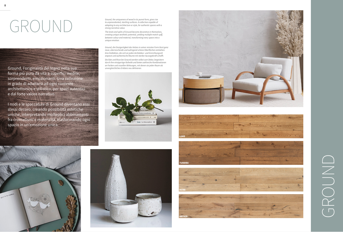 In Ground vive l’effetto materico del legno naturale, espresso nella sua forma più pura.