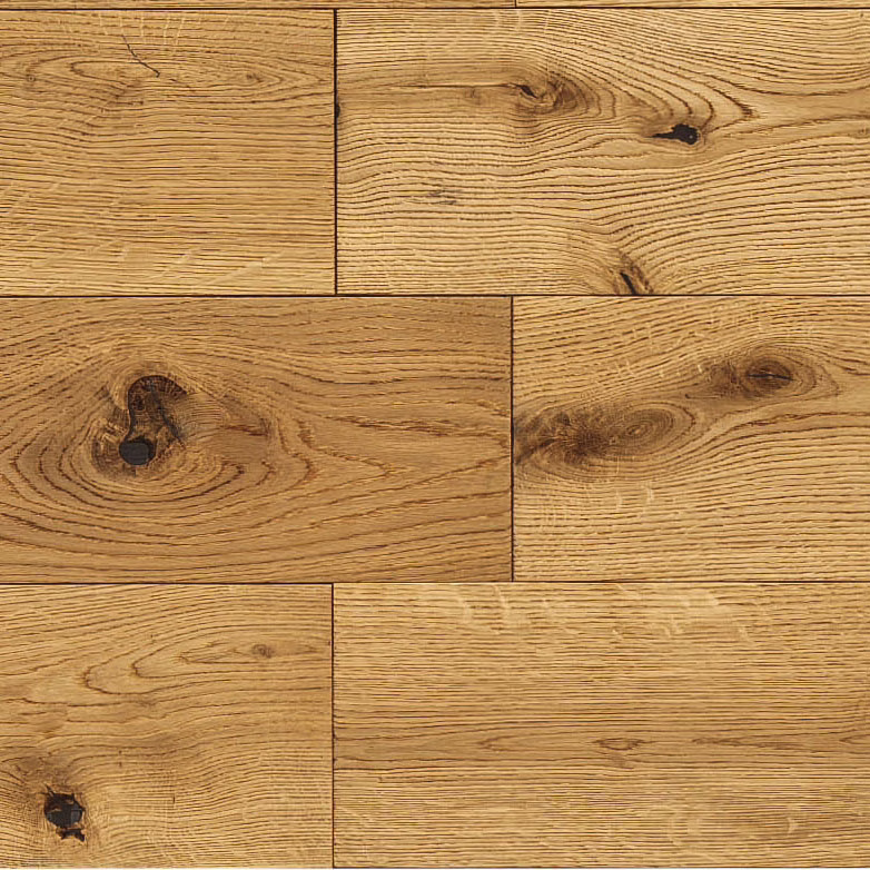 Parquet in rovere naturale in cui nodi e spaccature diventano parte integrante del disegno, trasformandosi in elementi decorativi e aprendo a possibilità estetiche uniche, tra cromatismi e matericità.