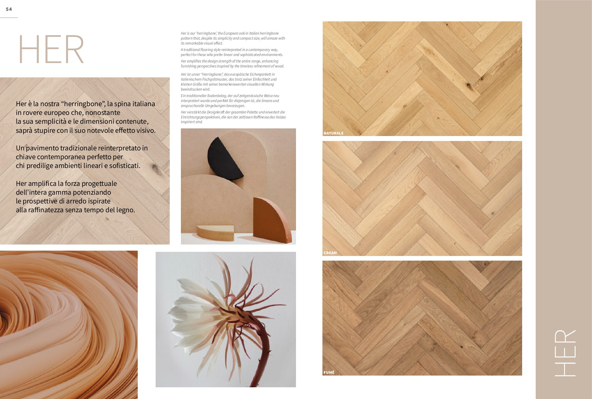 Her è la nostra herringbone, il parquet a spina italiana in rovere europeo che, nonostante la semplicità formale e le dimensioni contenute, sorprende per il suo forte effetto visivo.
