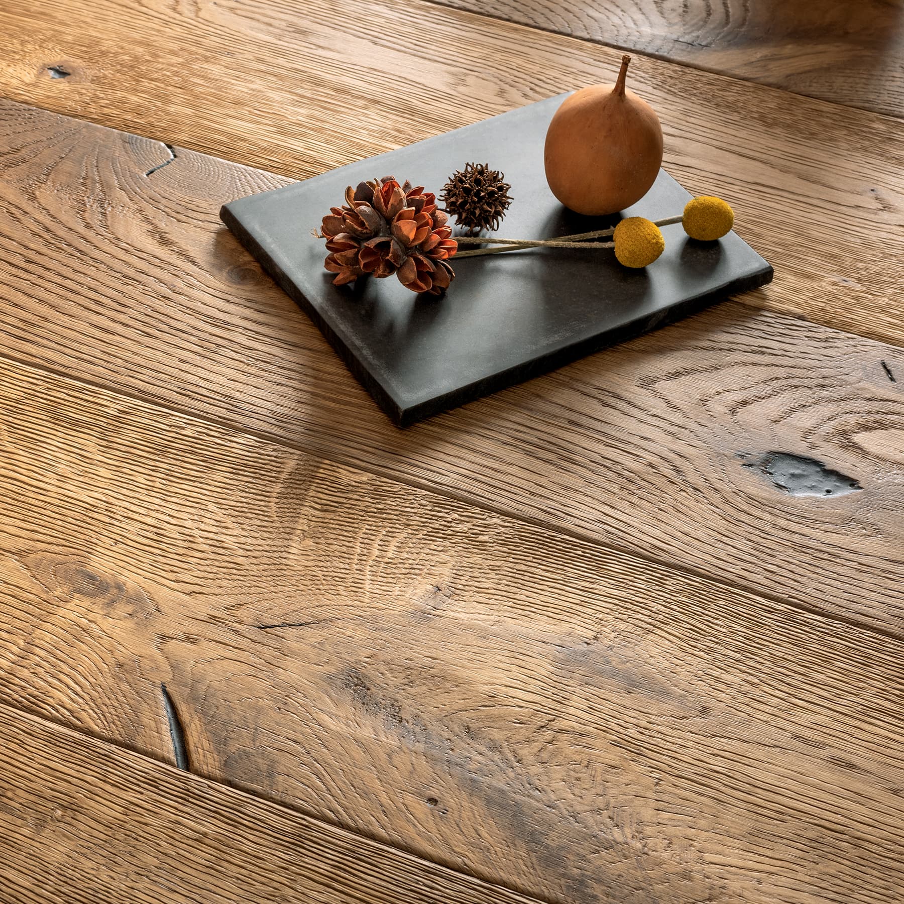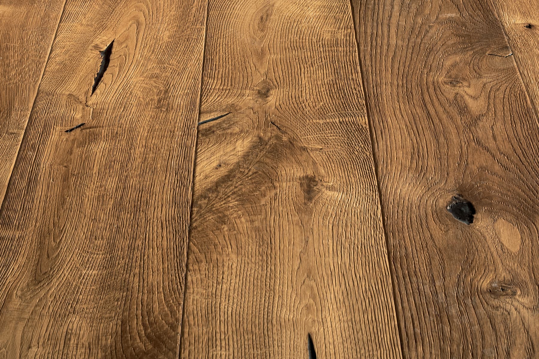 Ogni tavola è piallata a mano e spazzolata, un processo che restituisce superfici vibranti, capaci di dare forma a tavole autentiche, dal forte carattere materico.