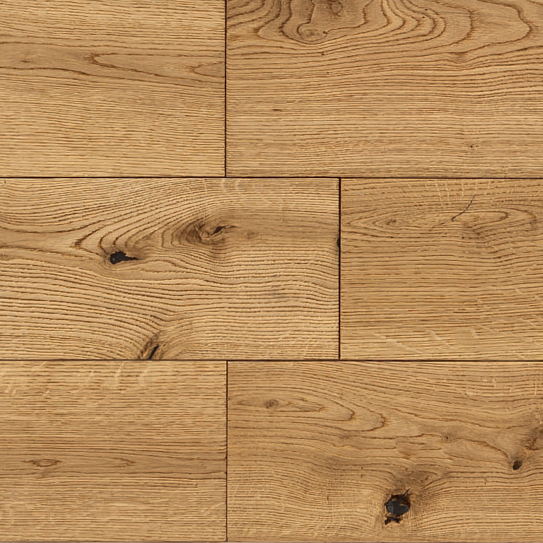 Natural oak parquet where knots and cracks become an integral part of the design, transforming into decorative elements and opening up unique aesthetic possibilities through chromatic variations and rich textures.